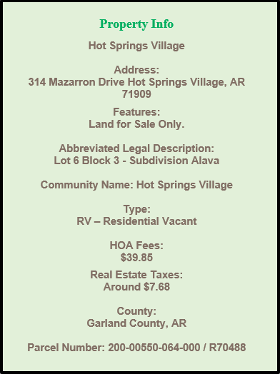 Land for Sale! No Reserve! Just Add $399 for Documentation Fees to bidding price. PAYMENT DUE WITHIN 24 HOURS OF AUCTION'S END. Welcome to your next home at Hot Springs Village!! I have not personally visited this property; however, I do know that it is a vacant lot which means a home does not exist on the Hot Springs Village property. You will be bidding on a lot within this community. Hot Springs Village offers a world of unlimited outdoor adventure and natural splendor just outside the national park and city of Hot Springs, Arkansas, and only a 45-minute drive from the state’s capital city, Little Rock, Hot Springs Village is the largest gated community in the United States. The community combines the best of the natural world with a rich culture of arts, entertainment, food and recreation. Recognized among ideal-LIVING’s Best Lake Communities, Hot Springs Village is a year-round staycation. (http://explorethevillage.com/)